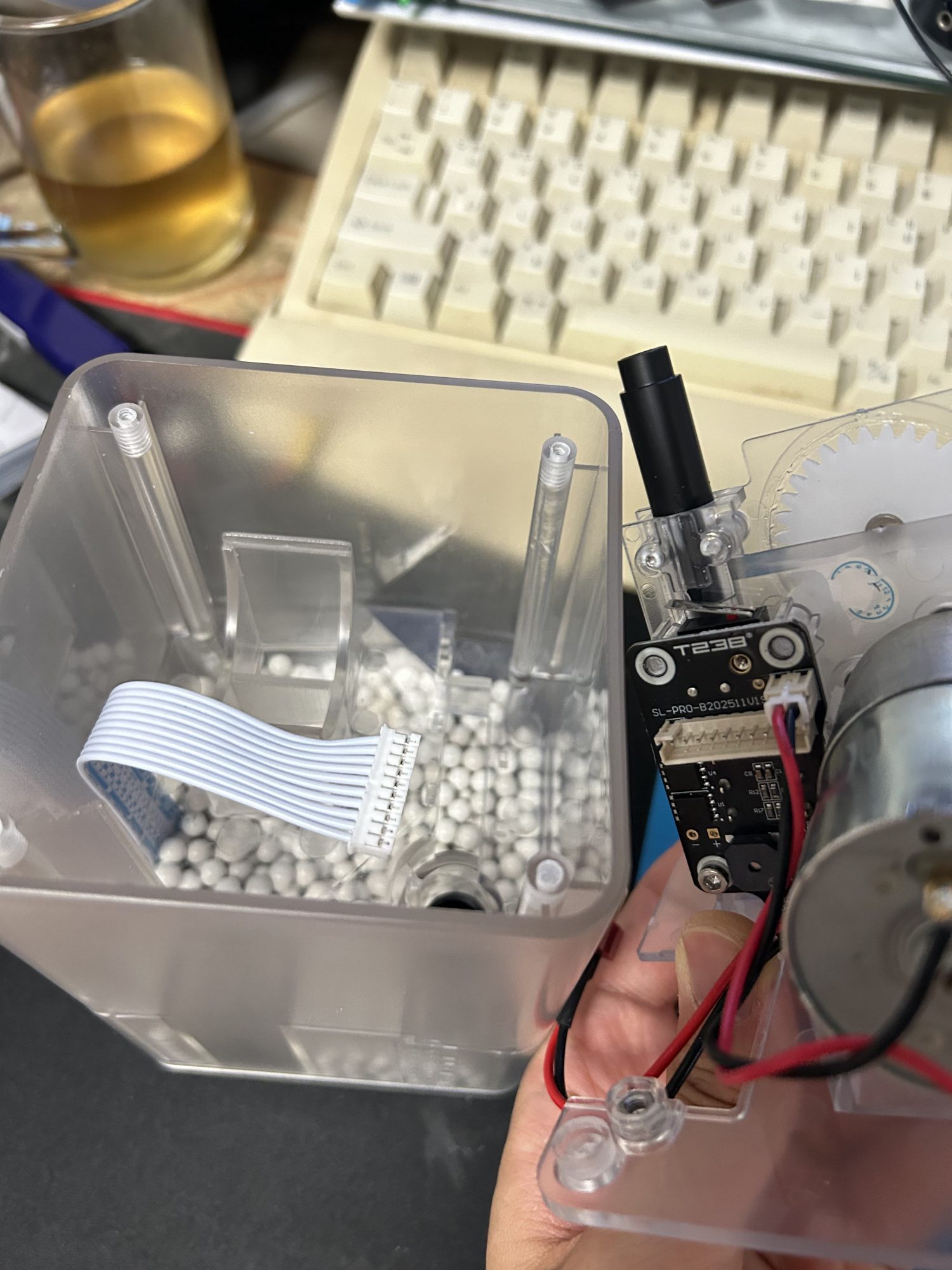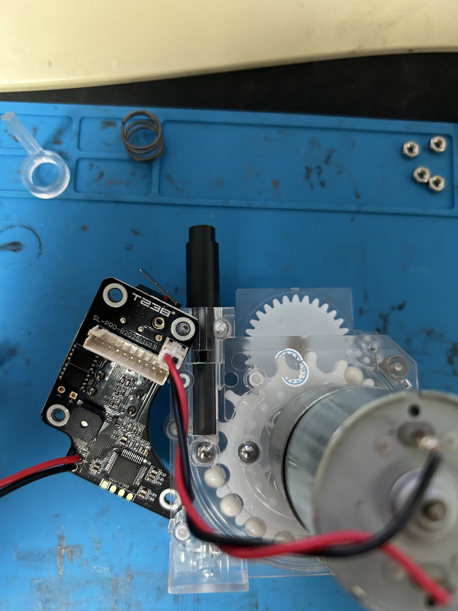 기판을 제거하면 쇠구슬 2개가 나오는데 저거는 엄청 중요한 역할을 한다. 비비탄이 들어있는지 체크하는거랑 기어가 돌아갔는지 체크하는거다.(추측임) 아마도 제대로 작동한다면, 비비탄 없이 기어가 돌면 그걸 체크가 가능하고 한클릭 더 돌려서 비비탄 수를 정확히 맞출수 있게 되어있는것 같다.